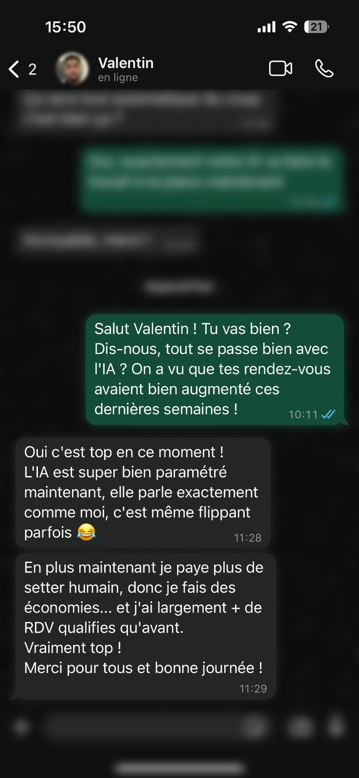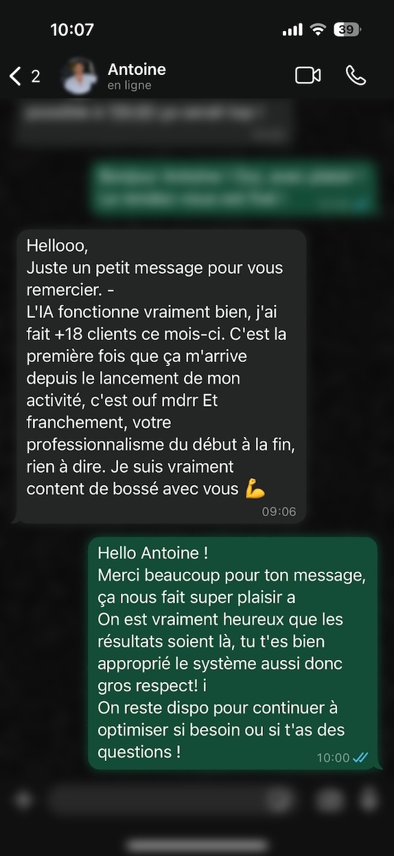 On s'occupe de tout. Configuration, personnalisation, tests, ton IA est prête en 1h, sans que tu aies à toucher quoi que ce soit.
